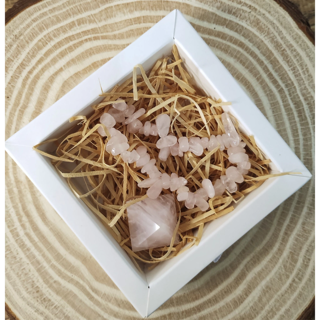 Nosso kit mãe amorosa é composto por uma mini pirâmide de quartzo rosa, uma pulseira de cascalho de quartzo rosa e uma caixinha de presente.